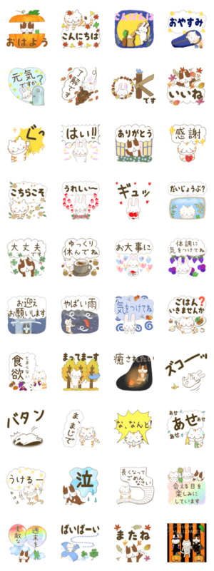 日常的に使えるデカ文字スタンプです。仲良しの犬、猫、うさぎがお茶目で可愛いイラストです。時々登場するカエルや青い鳥もポイントです。秋/友達/ハロウィン/台風