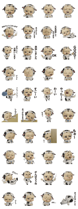 牛の着ぐるみを着たうしちゃんのスタンプです! ミルク大好き、元気いっぱいのうしちゃんです!JARO より発売