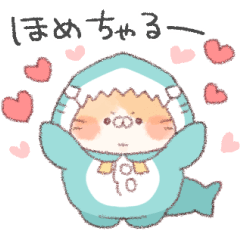 サメの着ぐるみを着た、にゃんこのスタンプです。褒めたり、励ましたりしちゃる!駄菓子屋 より発売