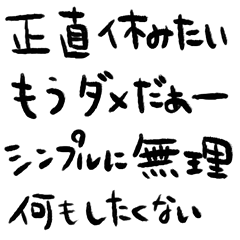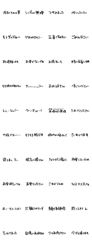 脱力系の文字スタンプ。縦幅短め省スペース仕様。仕事や家事や勉強や人生に疲れた人の感情を文字にのせました。