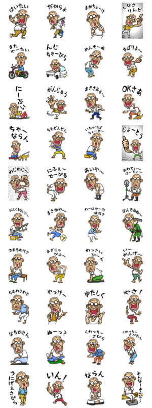 沖縄弁おじいさんの大きなスタンプ【BIG】バージョンです。大きな文字で読みやすく、見やすいスタンプになってます。全国47都道府県方言スタンプ販売してます。 ※このスタンプはトークルームで大きく表示されるBIGスタンプです。Brody Machine より発売