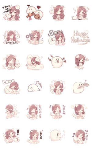 ハロウィンなお化けと女の子のスタンプです。hinacoco より発売