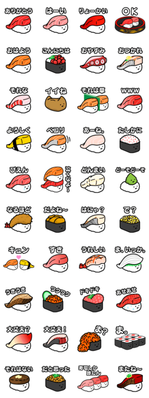 お寿司のキャラクターデザインがゆるくて可愛いと思いました。しかし、同じようなスタンプが多かったです。