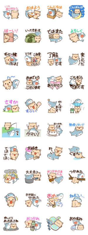 とらねこの『ちびトラ』と、かわいい鮫キャラの『ちびサメ』。可愛く、ペアで返事ができます。毎日よく使う言葉や、あいさつ等の、ずっと使える、さめと猫のスタンプです。かたこ より発売