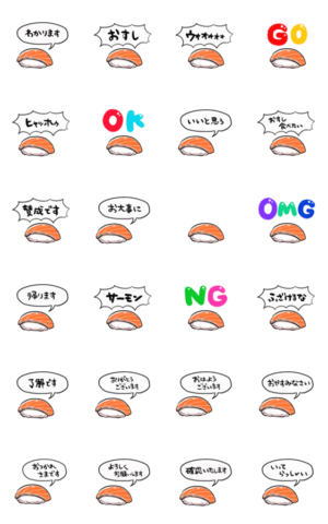 ふるえるサーモンのお寿司のスタンプです。オスシ好きな方とか鮭好きな方とかにどうぞ。シンプルな日常あいさつや敬語もあるので友達家族上司仕事先輩なんでもどうぞ。オカヤマ より発売