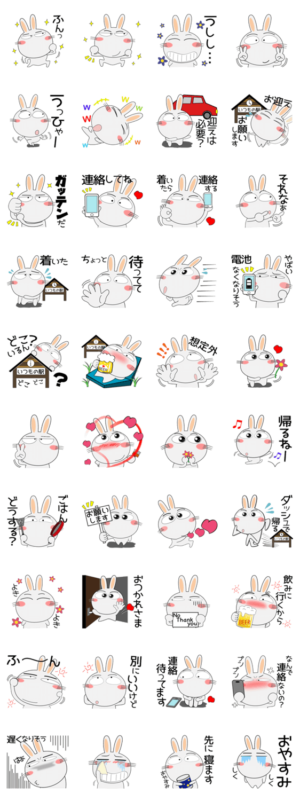 うさぎサンの家族・カップル向けスタンプ。毎日使える言葉、よく使う言葉を揃えました。家族も夫婦もカップルも。朝から夜まで使えます。迎えに来て~、いいよ、すぐ行くurajo より発売
