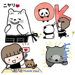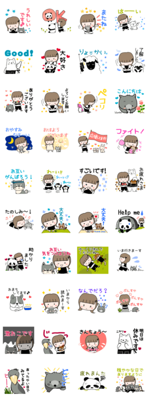 オシャレGirl と猫、犬、ウサギ、羊、ペンギン、パンダ、シロクマ、カワウソ、ハリネズミ、ウォンバット、ハシビロコウなどなど。好きな動物たちに囲まれたスタンプです。