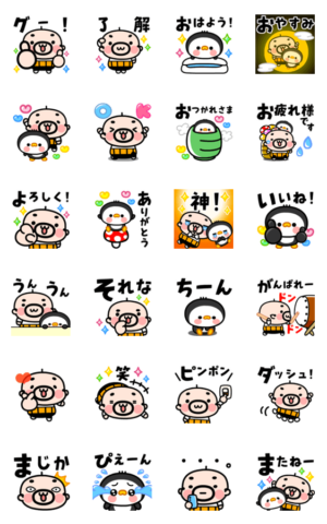 おやじ君とペンギンちゃんの毎日使える飛び出すスタンプ。定番の挨拶と返事がそろってます!友達との日常会話におすすめです♪前田ムサシ より発売