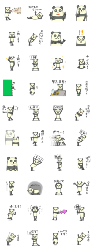了解、お疲れ様です、お世話になります、おはようございます、おやすみなさい、ペコリ、帰ります、少しお待ちを、また今度、など毎日つかえる白黒パンダのスタンプです。
