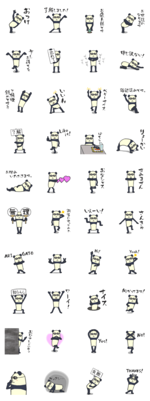 前回に引き続きのサングラスの白黒パンダ。喜んだり、ハートを飛ばしたり、いいねしたり、了解、お疲れ様です、お世話になります、少しお待ち、申し訳ない、確認済みなど。
