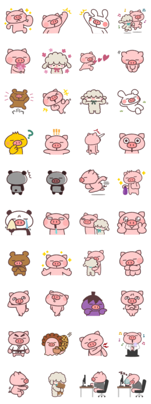 ぶたさんとその愉快な仲間たちがメインのスタンプ。イラストはまあまあ。表情や華やかさは普通といったところで全体的にまずまずの出来。ボリューム感は多め。