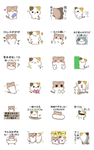 お疲れ気味 やる気が出ない時に使えるゆるかわ三毛猫とキジトラ白猫のアニメーションスタンプ第7弾 仕事 締め切り 進捗 社畜 体調不良 春夏秋冬 でか文字 ストレス
