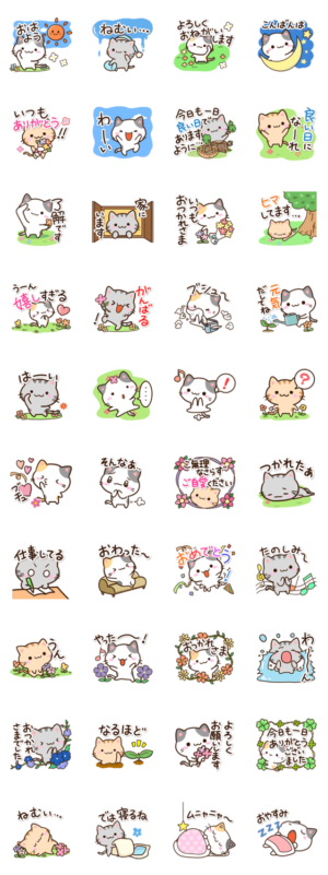 『小さい三毛猫』『小さいアメショ』『小さいトラネコ』『小さいブチ猫』が登場するスタンプです。よく使う基本的な言葉を集めました。ねこ好きな方にぜひ。【かたこ】