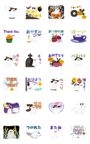 絵本みたいな可愛いおばけのスタンプはハロウィンVer。挨拶やリアクション満載で使いやすくてイベントにぴったり!仲間のかぼちゃやお菓子もたくさん!