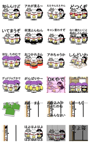 どことなくオバンみのあるねこちゃんたちのスタンプ。汎用性はそこそこだが印象的ではある。