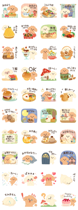 甘さ控えめ大人かわいいふわもこのトイプードル秋♪毎日のあいさつにずっと使える!気づかい、敬語や挨拶あり。 北欧絵文字とも楽しめます。家族、ママ友、カップル、イヌ