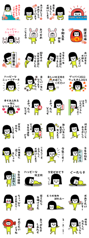 頑張る女性の為のビジネスシーンや職場の人へ使える敬語スタンプ年末年始編。新年(お正月)・大晦日の挨拶、年賀状代わりに黄色全身タイツOLがメッセージをお届けします。※2023/1/3(火)23:59までに購入すると特典「LINEおみくじ」がもらえます。panda-chocolate より発売