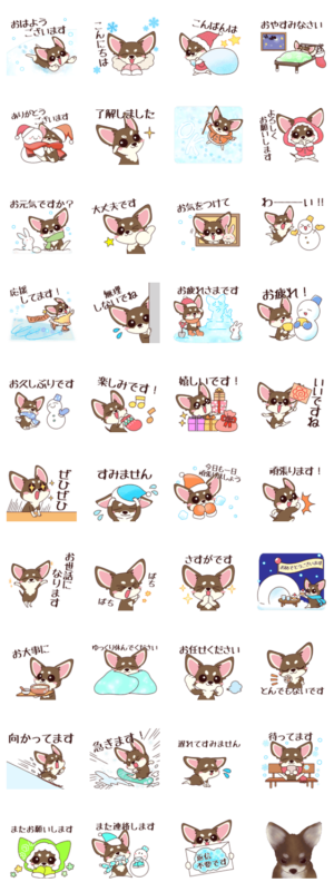 冬シーズンに使いやすいチワワ(チョコタン)のスタンプです。上司やお客様やお友達など色々な方々にも使いやすい内容です!