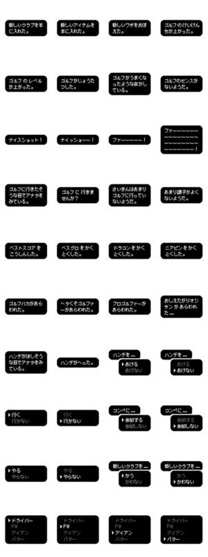 懐かしのRPGゲームのクエストに出てくるドットコマンド風スタンプ。第5弾はゴルフに特化!ドラゴンは倒せませんが、ゲーム感覚でゴルフトークができます。