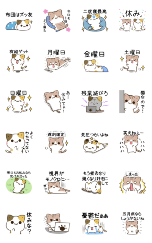 お疲れ気味 やる気が出ない時に使えるゆるかわ三毛猫とキジトラ白猫のアニメーションスタンプ第8弾 仕事 締め切り 進捗 社畜 体調不良 春夏秋冬 でか文字 ストレス 気圧つきしろ より発売