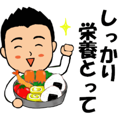 笑顔のサラリーマンの【眼鏡無し】バージョン。今回は体調など相手を気づかう言葉が中心のスタンプ。見やすいデカ文字挨拶付き。秋冬、男性、めがね、気遣い、優しい言葉
