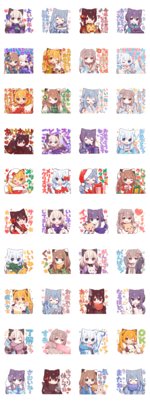 猫少女達の冬スタンプです。クリスマスや大晦日、お正月など、年末年始、冬に使いやすい言葉やリアクションが沢山入っています。※2023/1/3(火)23:59までに購入すると特典「LINEおみくじ」がもらえます。