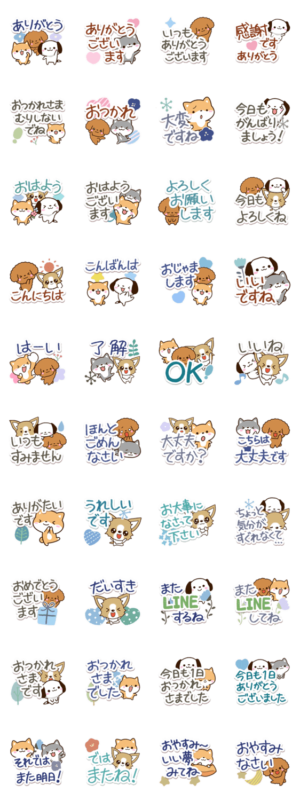 わちゃわちゃドッグ達のふんわりした絵柄のスタンプ。セリフは日常使い出来るものばかりです