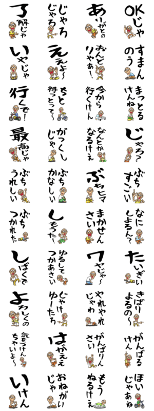 広島弁おじいさんの【デカ文字】スタンプです。文字が大きいので、すごく読みやく、わかりやすいスタンプになってます。全国47都道府の県の方言スタンプも好評販売中です。 ※このスタンプはトークルームで大きく表示されるBIGスタンプです。Brody Machine より発売