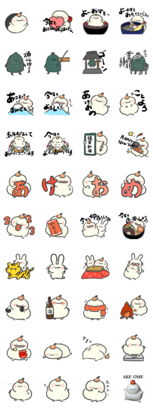 鏡餅のもっちの2023年用お正月(少し年末)スタンプです。煩悩を憎んでいる鐘と距離感がおかしいウサギもいます。実写もっちも登場。難解漢字は「ぼんのう」です。※2023/1/3(火)23:59までに購入すると特典「LINEおみくじ」がもらえます。いしやまやまき より発売
