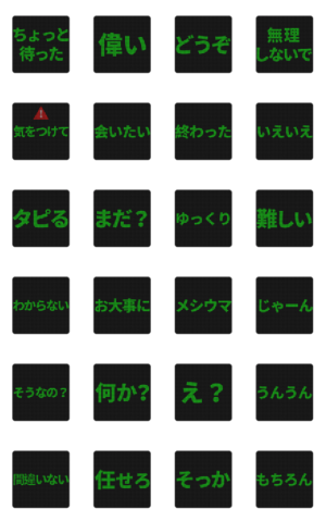 テロップ:ちょっと待った.偉い.どうぞ.無理しないで.気をつけて.会いたい.終わった.いえいえ.タピる.まだ?ゆっくり.難しい.わからない.お大事に.メシウマ.じゃーん...