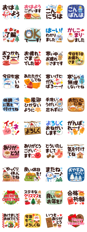 ちょっとだけ大人の、シンプルで見やすいデカ文字スタンプ。寒い冬にぴったり!クリスマス、年末年始、バレンタインにも使えるほっこり便利なスタンプです♪みーすけ より発売