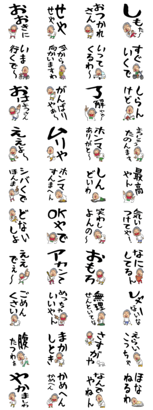 関西弁おばあさんの【デカ文字】スタンプです。文字が大きいので、すごく読みやく、わかりやすいスタンプになってます。全国47都道府の県の方言スタンプも好評販売中です。 ※このスタンプはトークルームで大きく表示されるBIGスタンプです。Brody Machine より発売