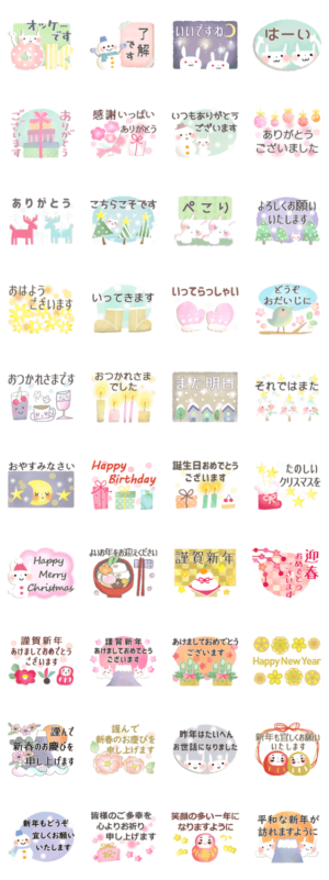ほっこり優しい冬に贈るシンプルなメッセージ。日頃の感謝を込めて気持ちを伝えたいあの人へ。丁寧なことば、敬語が多めで使いやすいスタンプです。