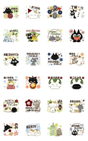 黒ねこ&みけさんの動く年末年始スタンプです♪まちゃの部屋 より発売