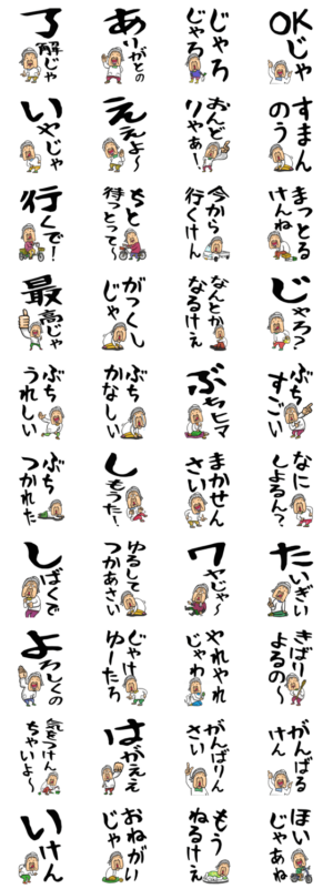 広島弁おばあさんの【デカ文字】スタンプです。文字が大きいので、すごく読みやく、わかりやすいスタンプになってます。全国47都道府の県の方言スタンプも好評販売中です。 ※このスタンプはトークルームで大きく表示されるBIGスタンプです。Brody Machine より発売