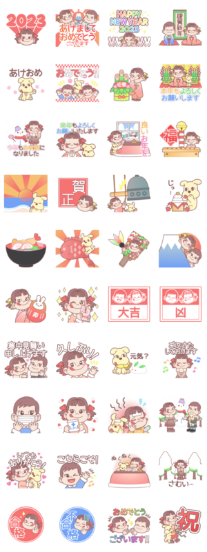不二家の大人気キャラクター、ペコちゃんが年末年始をお祝いするよ♪ハッピーな気分でお正月を満喫しよう☆※2023/1/3(火)23:59までに購入すると特典「LINEおみくじ」がもらえます。NOS Inc. より発売