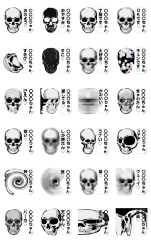 〇〇〇ちゃん部分に好きな子の名前を入れてメッセージを送ろう/骸骨/ドクロ/髑髏/髑髏/スカル/ラブラブ/大好き/毎日使える/日常会話/挨拶/カップル/恋人/彼氏/彼女 現在この商品は一部のスマートフォン版LINE 10.3.0以上のトークルームでのみ使用できます。動作環境の最新情報はヘルプをご確認ください。4A-Studio(よんえーすたじお) より発売