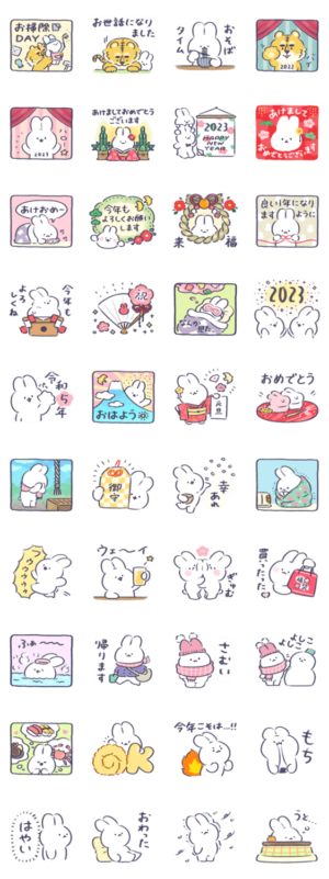 うさぎさんの年末年始、お正月詰め合わせスタンプです。※2023/1/3(火)23:59までに購入すると特典「LINEおみくじ」がもらえます。