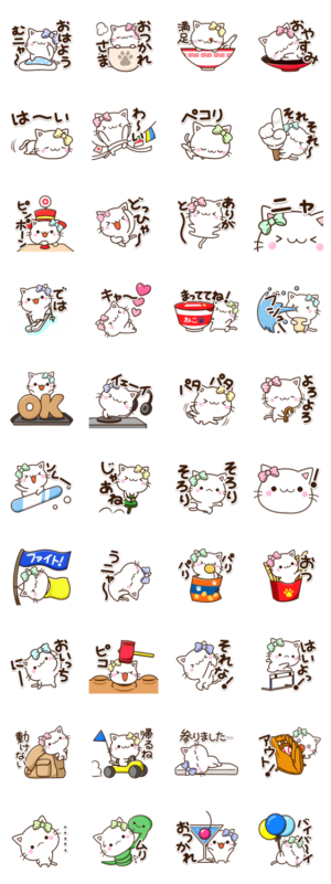 リボンをつけた小さい白猫の『ちびシロ』。よく使うあいさつや、言葉等、毎日便利なネコスタンプです。しろねこ好きな方にぜひ。【かたこ】かたこ より発売