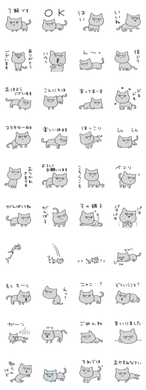 グレーな猫のグレネコ新登場。「了解です」「いいね」から「ペコリ」まで。シンプルで使いやすい定番言葉がいっぱい。家族、学校、お仕事でも。Mami / エストループ より発売
