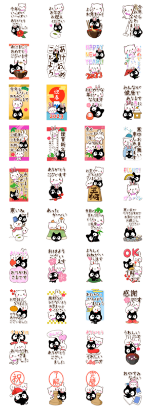 クロネコすたんぷと、シロネコすたんぷとうさぎの2023年用の新年あいさつスタンプ。ふだんの感謝を伝えるときにも使える、便利なねこスタンプ。【かたこ】※2023/1/3(火)23:59までに購入すると特典「LINEおみくじ」がもらえます。かたこ より発売
