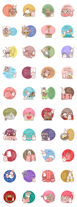 キュートなうさぎさんの年末年始に使いやすいスタンプです。 お正月、クリスマス、寒中見舞い、喪中、お誕生日に。※2023/1/3(火)23:59までに購入すると特典「LINEおみくじ」がもらえます。