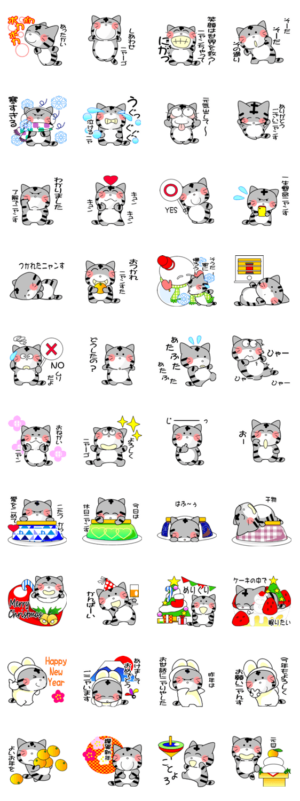 いつでも楽しく使える可愛い3匹の猫さん達の冬のサバトラ編。クリスマスやお正月スタンプも少しあります。