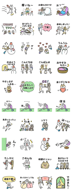シュッとスリムな猫たちの毎日使える冬スタンプ。挨拶やお返事などよく使う言葉をたくさん詰め込みました!OTOBOOK より発売
