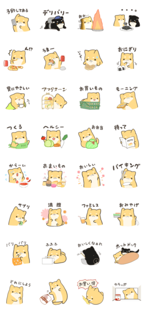 ゆるい柴犬のスタンプ。食事の話や食べ物の話向け。ももくらげ より発売
