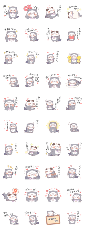 サメの着ぐるみを着た、パンダのスタンプです。かまってほしい時などにオススメです!駄菓子屋 より発売