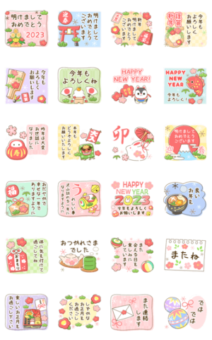 賑やかに飛び出る楽しいポップアップスタンプです。誰でも使えるシンプルで使いやすい年賀状デザイン。 大晦日、年末年始、新年、お正月の挨拶に使って下さい♪※2023/1/3(火)23:59までに購入すると特典「LINEおみくじ」がもらえます。めいぷる より発売