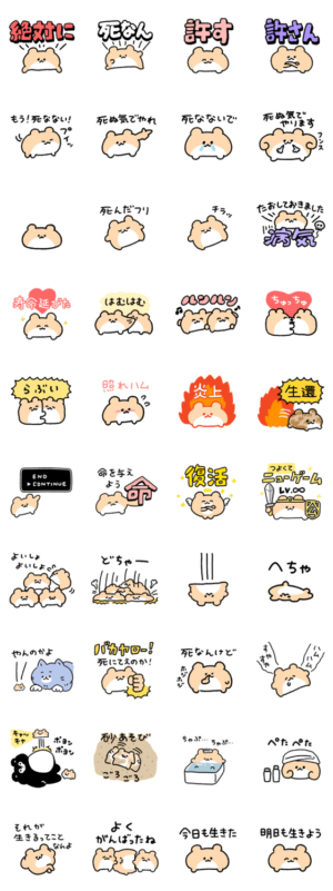 絶対に死なないハムスターのスタンプです。ニコニコした表情が特にかわいらしいです。