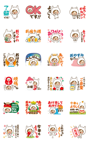 年末年始にぴったりなかわいい女の子のお正月・年賀の動く冬スタンプです!かわ主婦がうさ主婦に!新年の挨拶にぜひお使いください!兎年・うさぎ※2023/1/3(火)23:59までに購入すると特典「LINEおみくじ」がもらえます。アグリム より発売