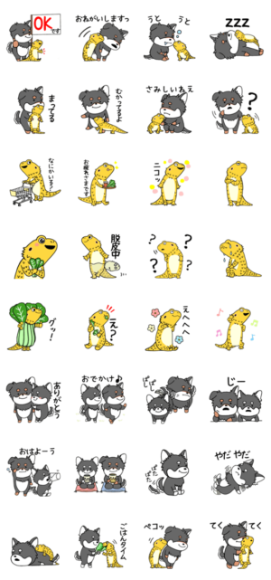 トカゲとチワワ!?変わったコンビの珍しいスタンプ♪フトアゴヒゲトカゲのしゃくれ君、チワワのあんちょび仲良しな3ぴきでトークを楽しもう♪